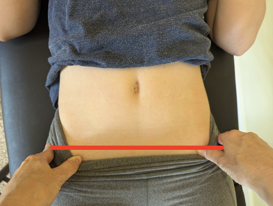 A hip bone that is rotated downward in the front can be seen from the outside by finding a bony landmark called the ASIS, where the hip bone curves downward in the front. With a thumb on each ASIS, you can look to see if one is lower than the other one.