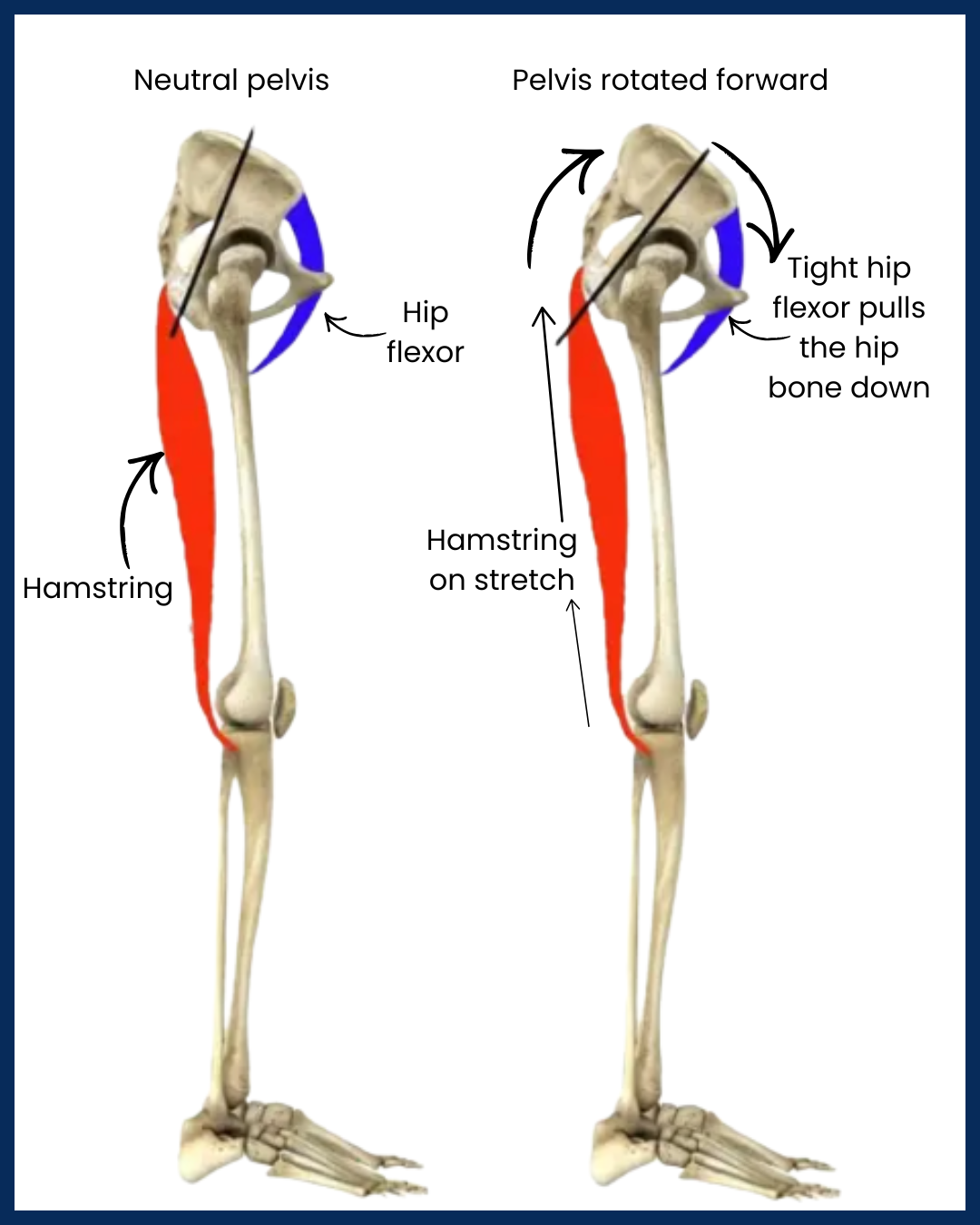 A forward tilted hip bone puts extra stress on the hamstring.