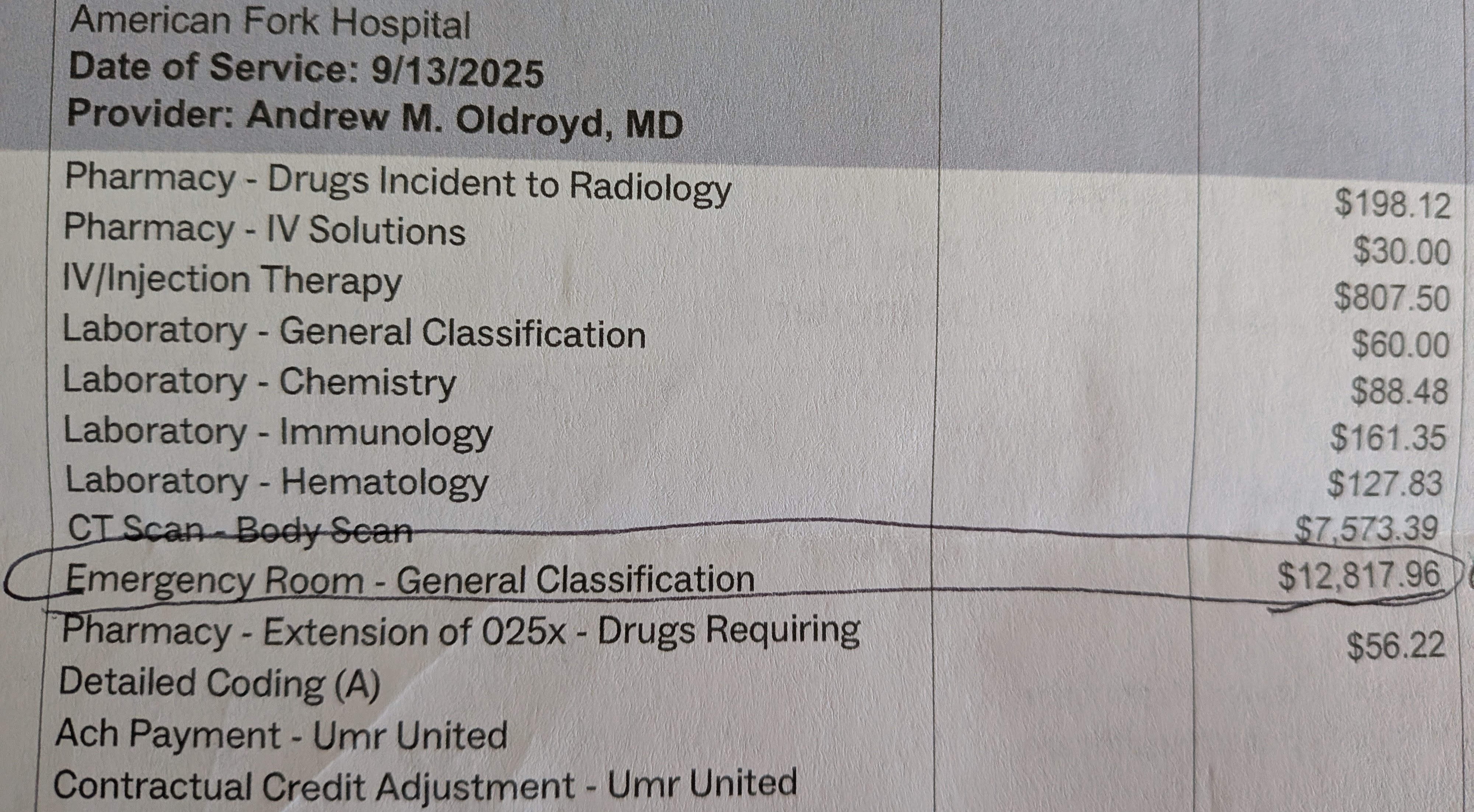 Now let’s take a look at the bill. I’m not going to get into details about all the costs, but I’ve circled the line that says "Emergency Room - general classification". This is the amount charged before the insurance paid anything - and this is just to sit in that room, have someone ask questions, a nurse start an IV and bring some pain medicine, and a doctor make some decisions - 2 hours max. The pain medicine, the IV, and the CT scan were separate charges.