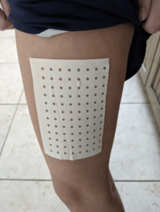 The patch comes in a 5 x 8 ish inch sheet. I cut the patch into smaller pieces, depending on the size of the area I’m wanting to cover. I find it really helpful for low back pain, but I often use it on other muscle areas as well, such as the hamstrings, groin or hip flexors. Many athletes prefer using them to wearing a sleeve, as they don’t like to wear anything on their legs.